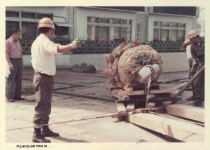 当山33世梅洞院日浩上人の時、第2次世界大戦中で日本は金属を供出しなければなりませんでした。そこで、本蓮寺は梵鐘を出し、階段の手すりを外して、同でできた燈籠までも供出しました。長い階段の手すりがなくなってしまったため、ご高齢の方がお参りする際はきっと難儀されたことでしょう。